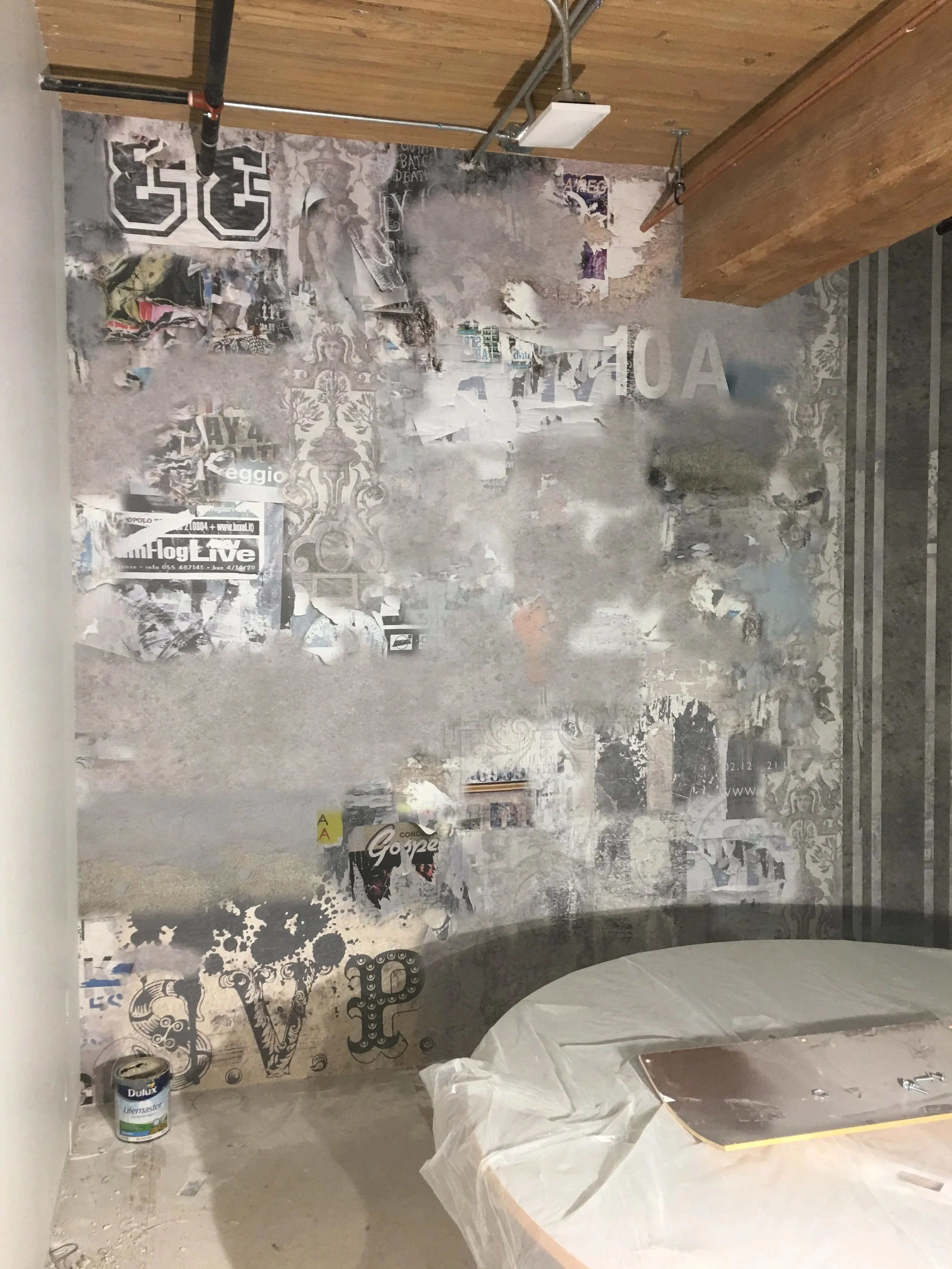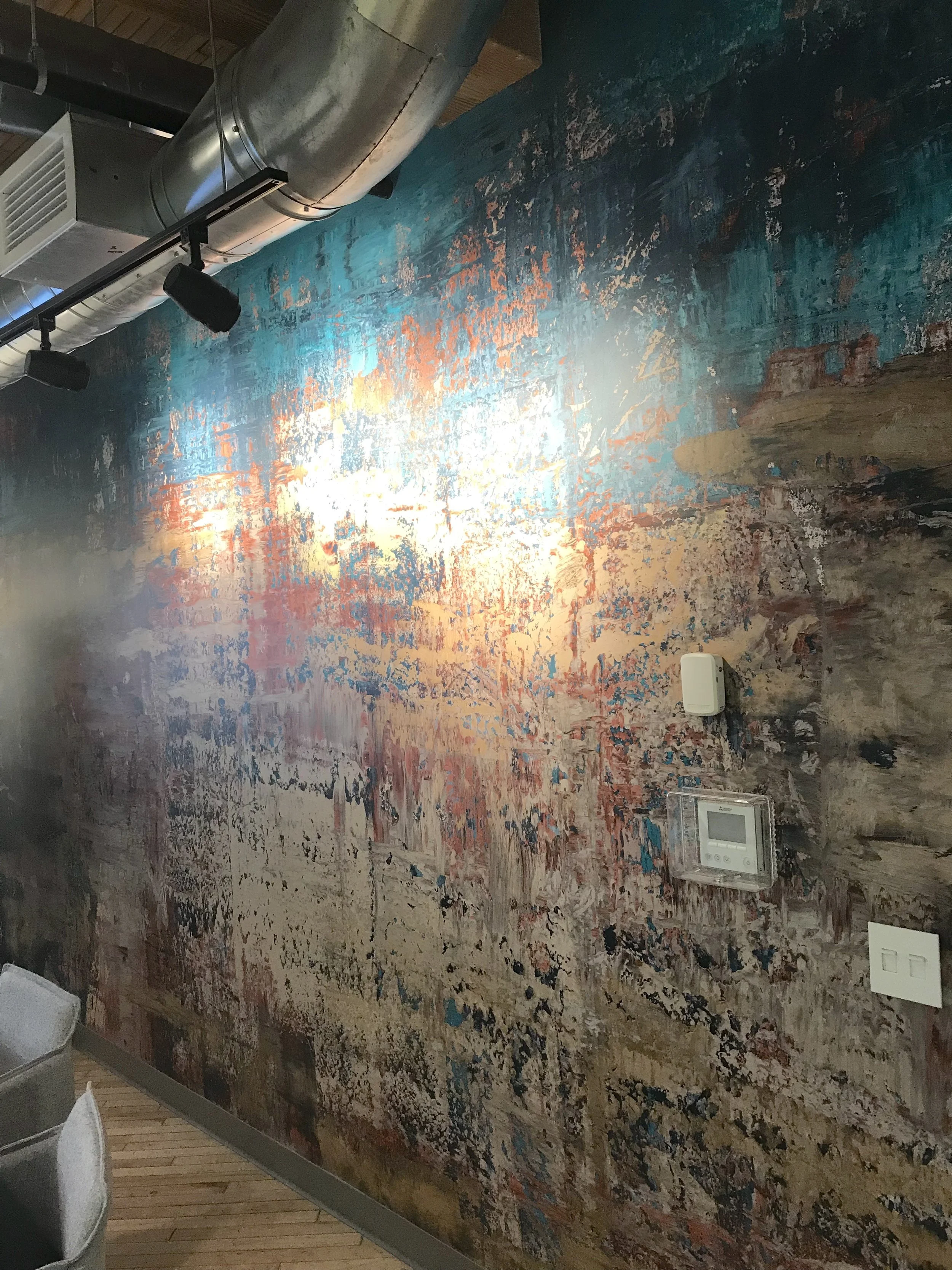 A client in the Entertainment District of Toronto retained us to execute a vibrant colour schemed interior fit out, with cool painted hubcaps handing from the ceiling to extremely unique wall coverings in their offices.